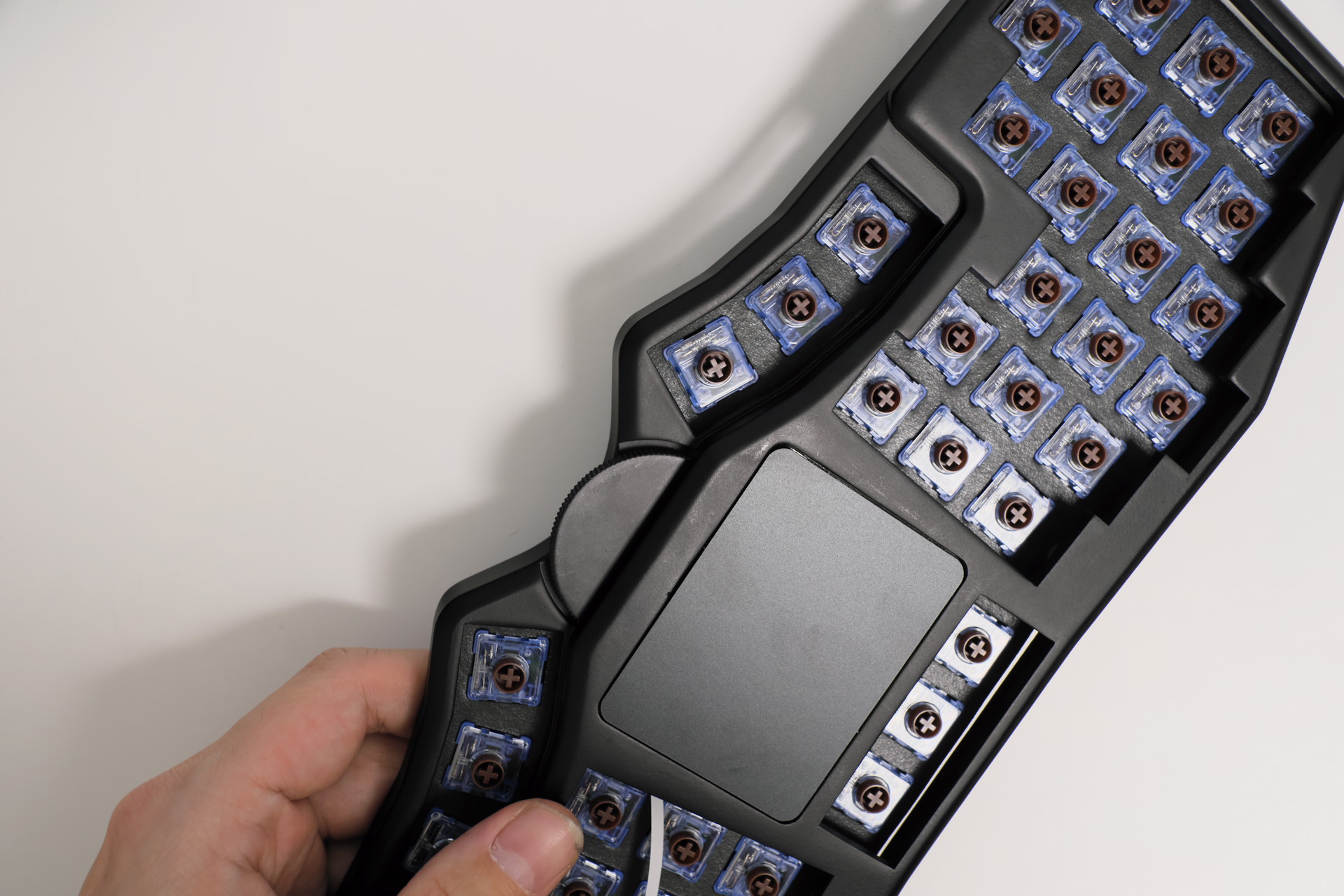 PCBの表面がトップケース側に来るようにして、PCBをたわませながら、ホイールをトップケースの隙間に差し込みます。 スイッチが干渉して作業しにくい場合は、一部のスイッチを外してください。 また、無理に差し込まないでください。